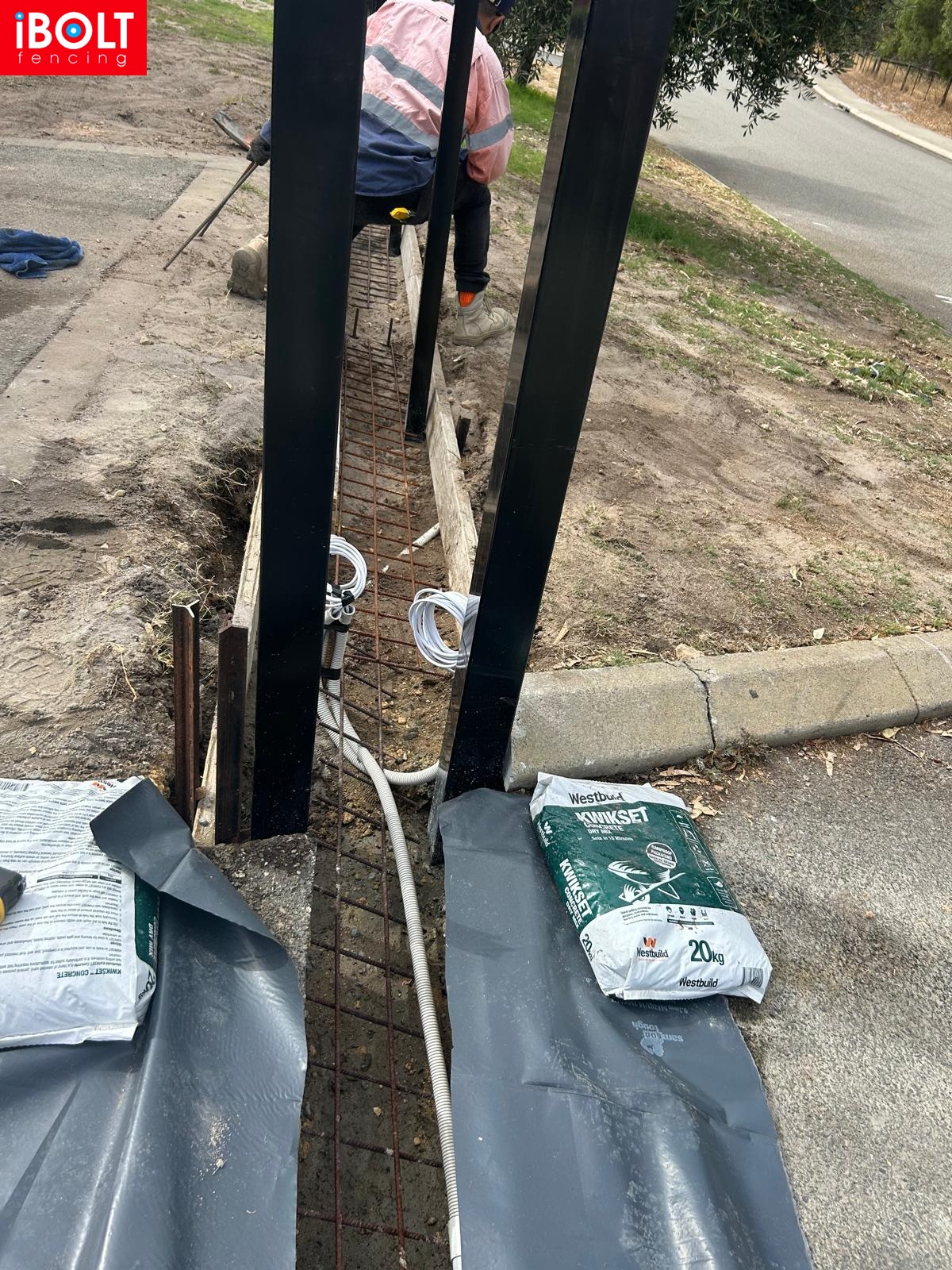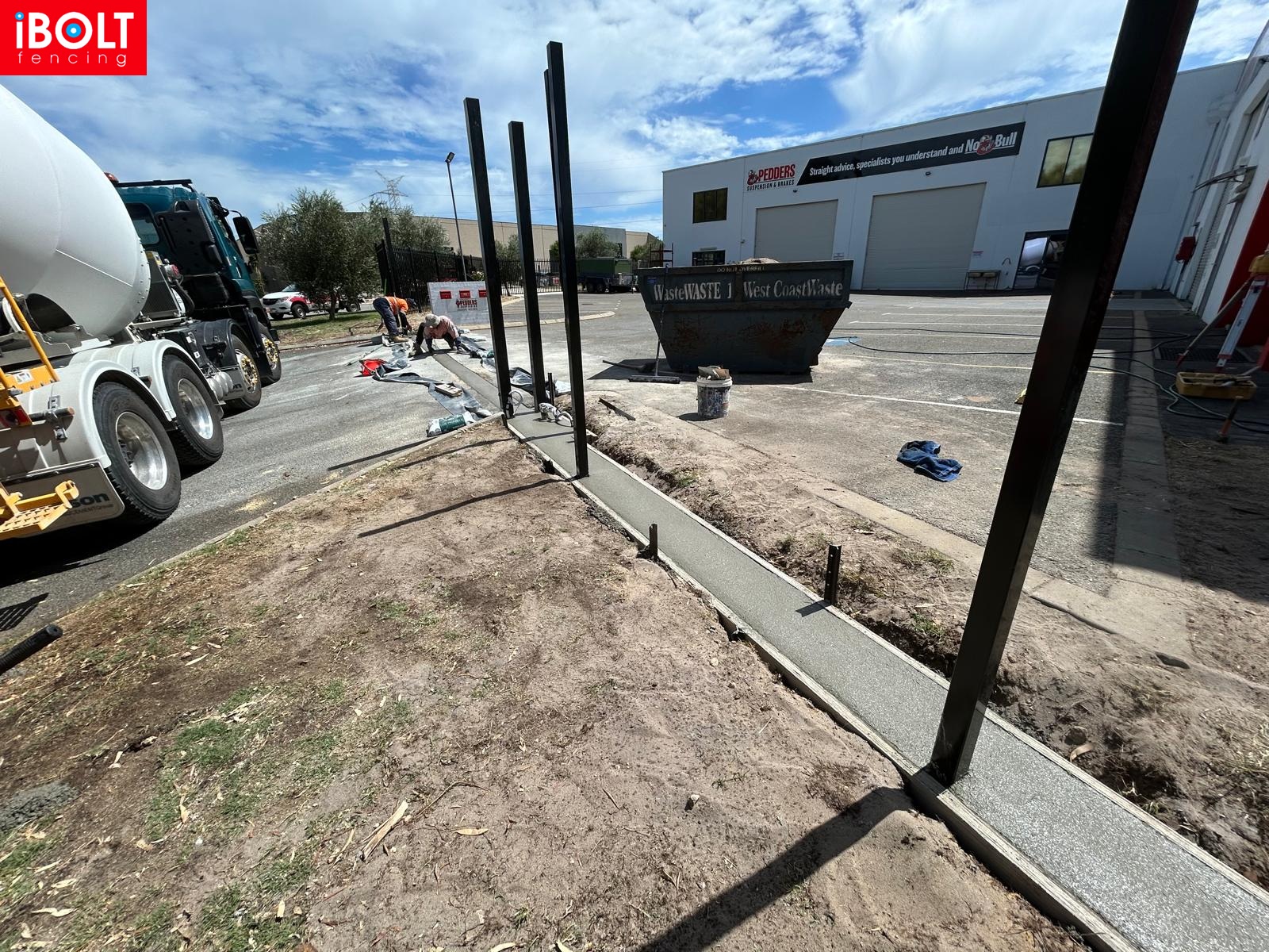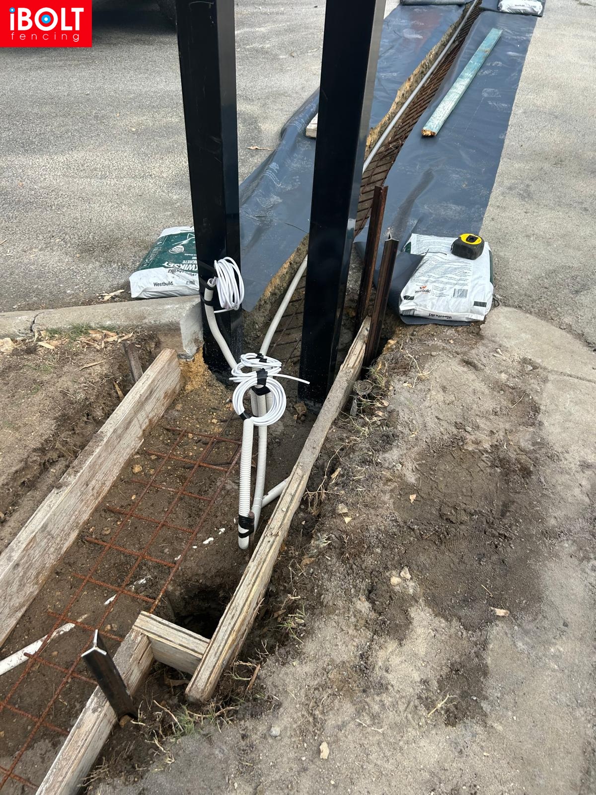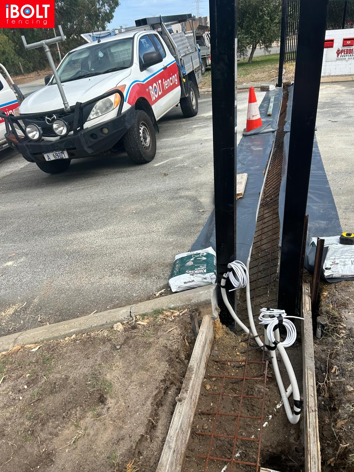 Concrete plinth for sliding gate installation at Suspension Pedders — delivered by Ibolt Fencing with precision and durability.