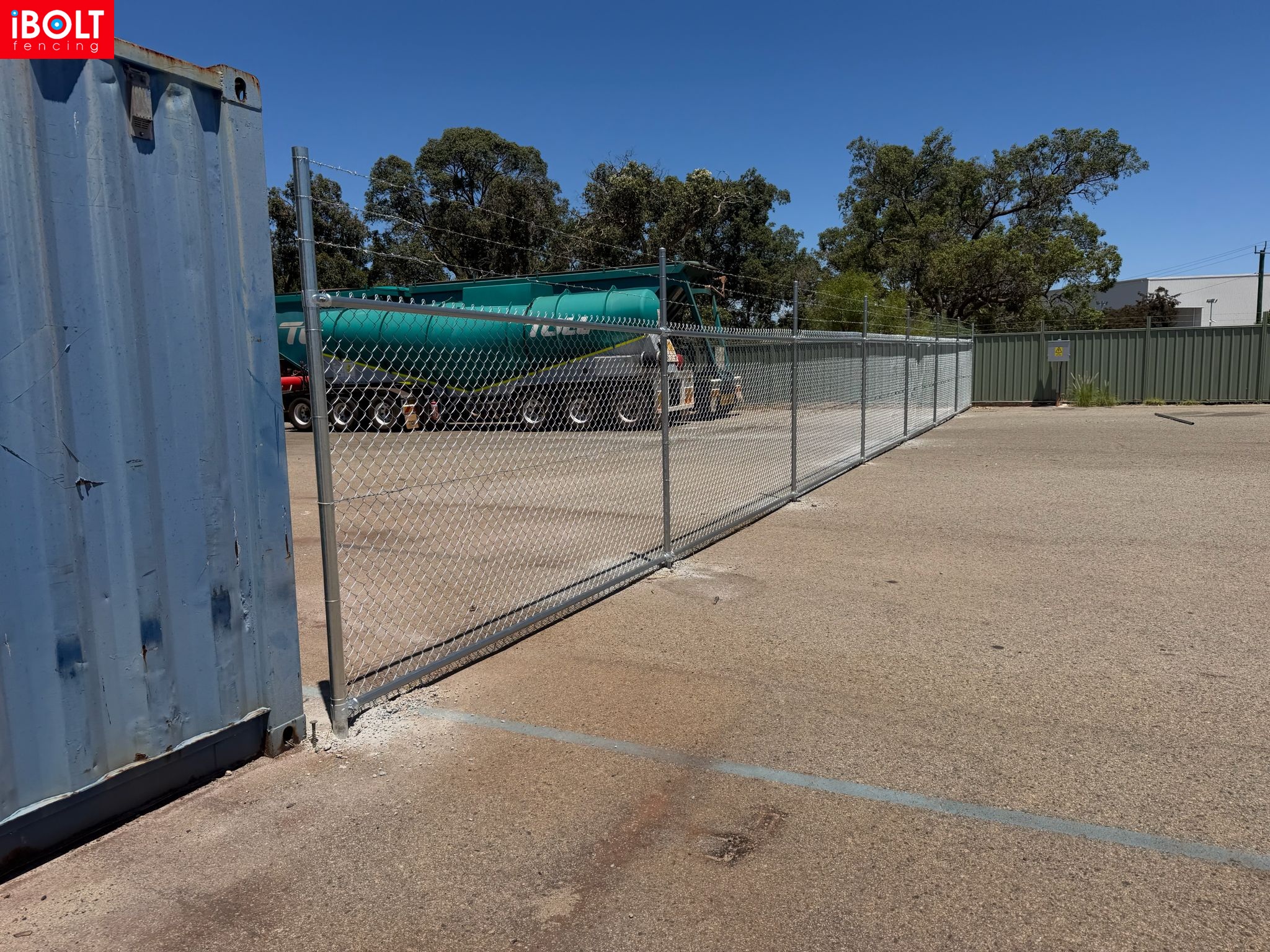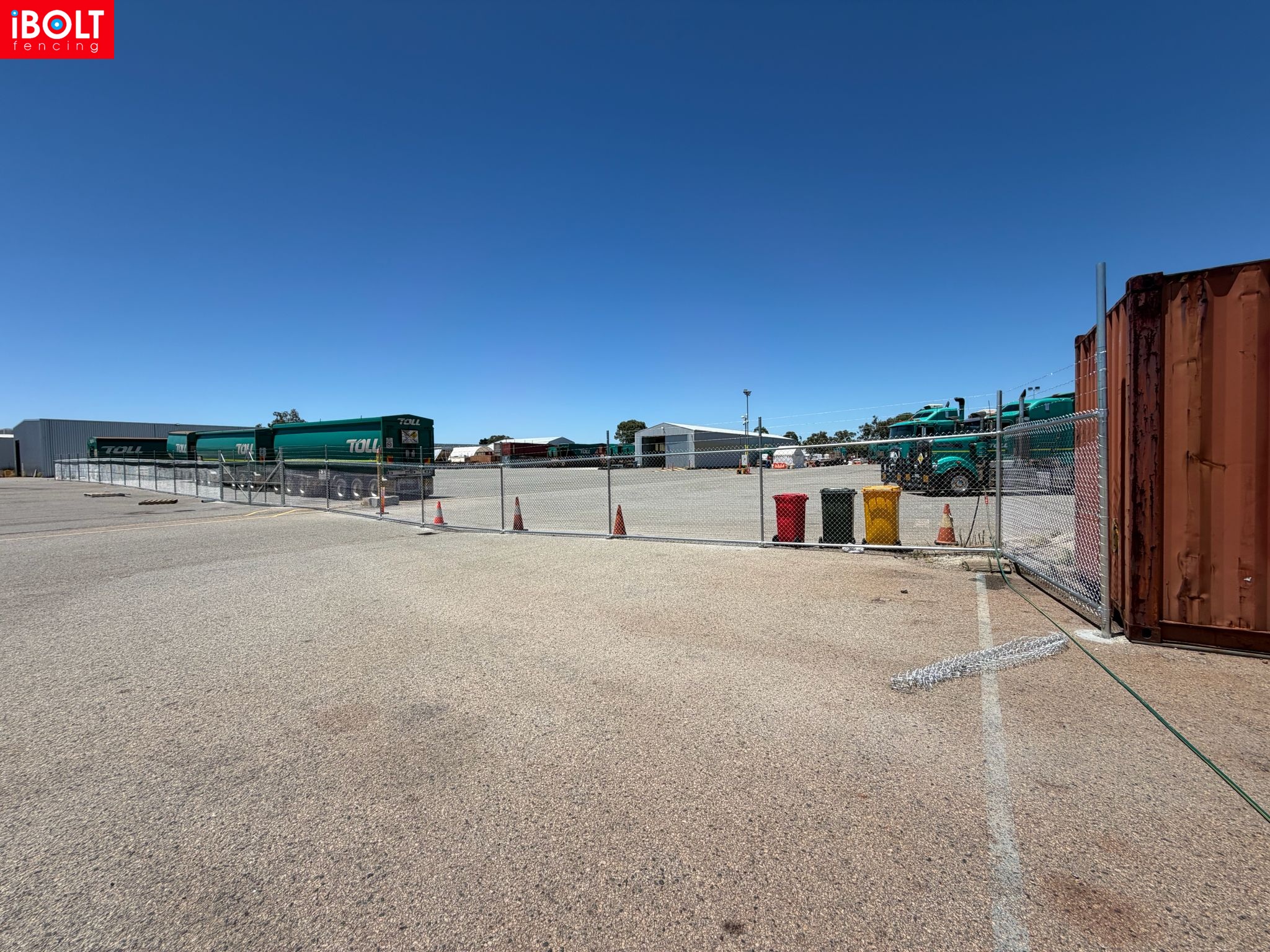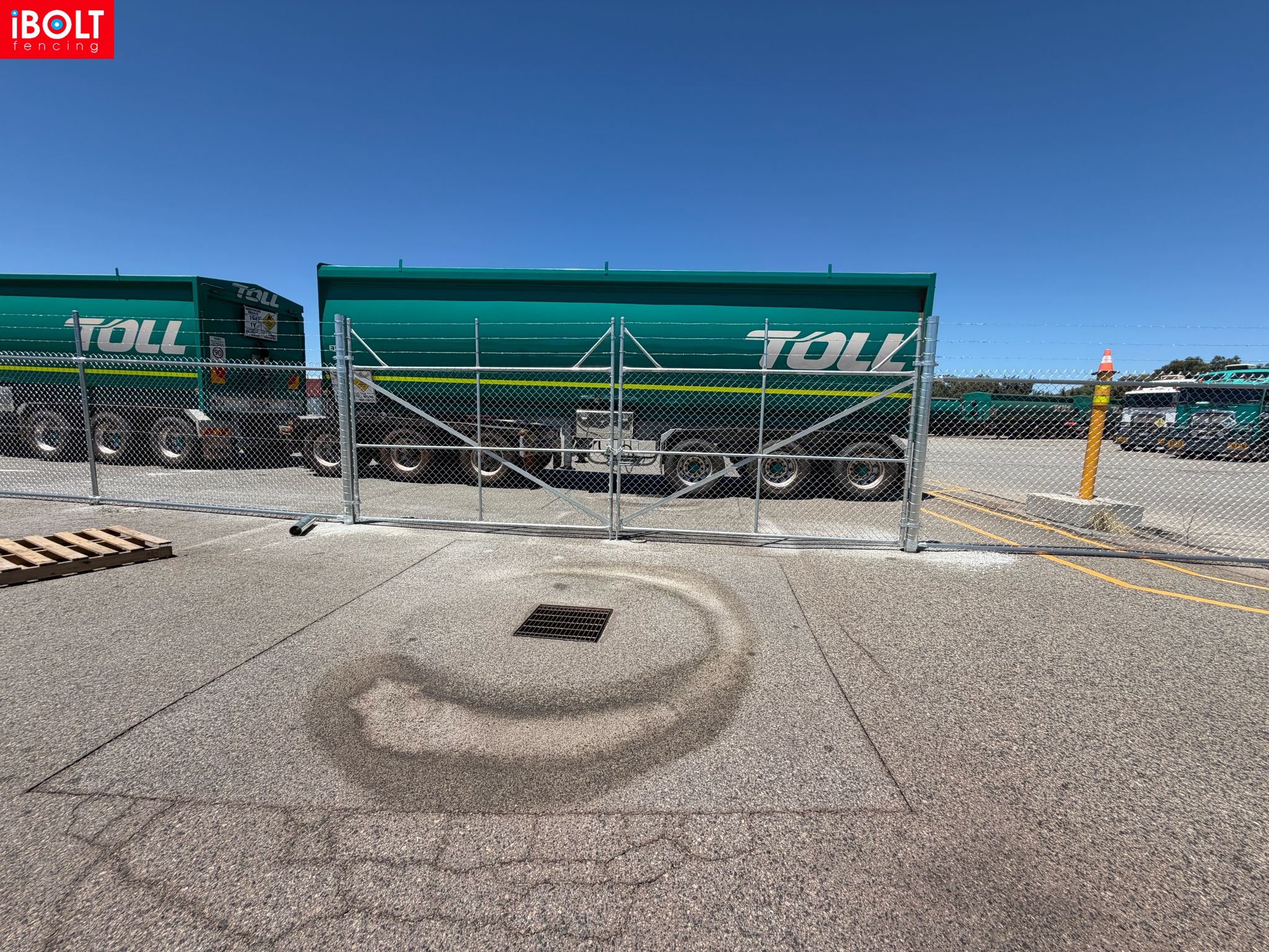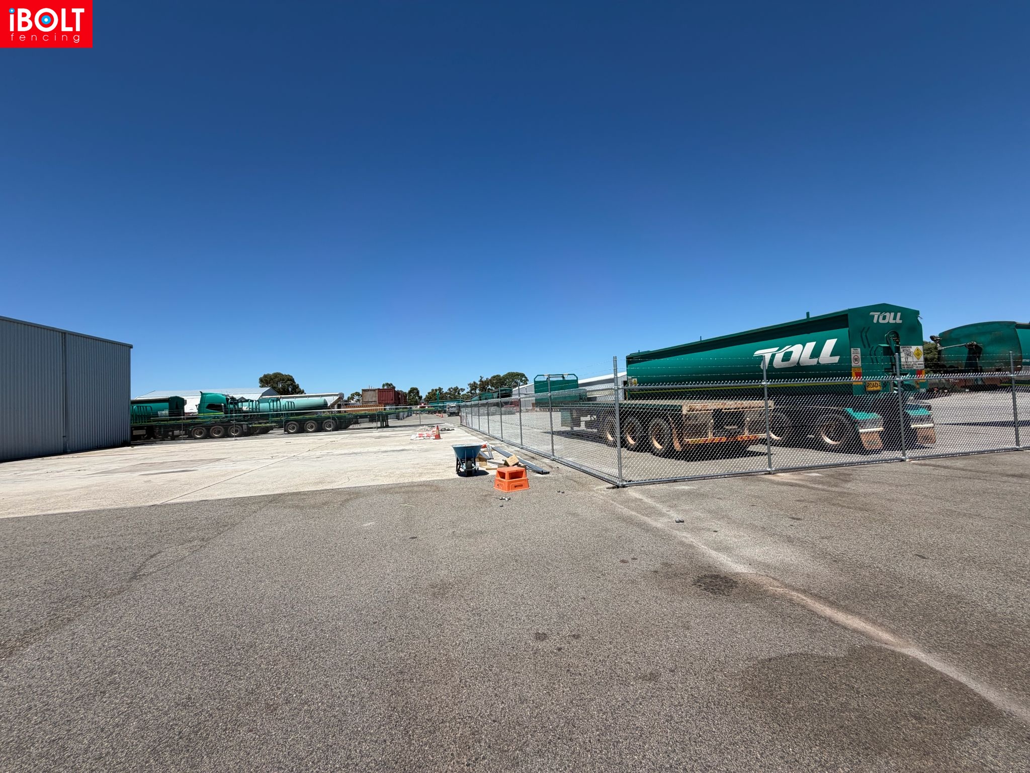 Hesperia – Toll Mining Fencing & Gates Project: Galvanised chainmesh fencing with barbed wire, chainmesh double swing gates, garrison fencing with an automated sliding gate, and reinforced concrete footings core drilled through bitumen, delivered by iBOLT Fencing for long-term industrial performance.