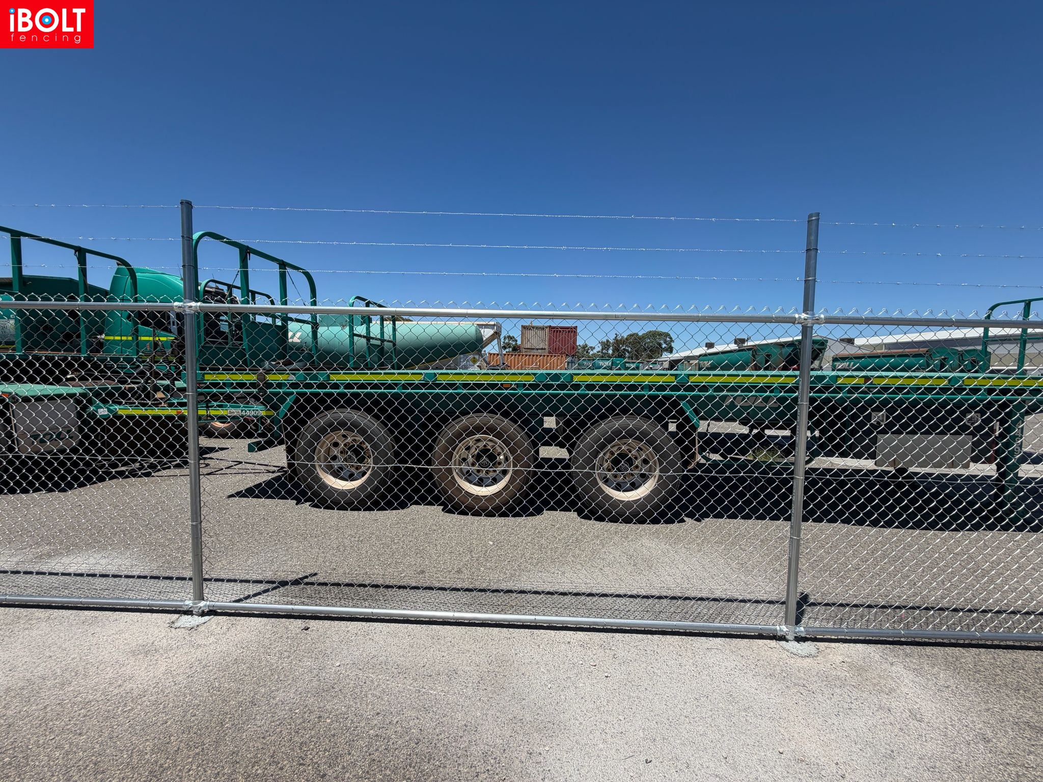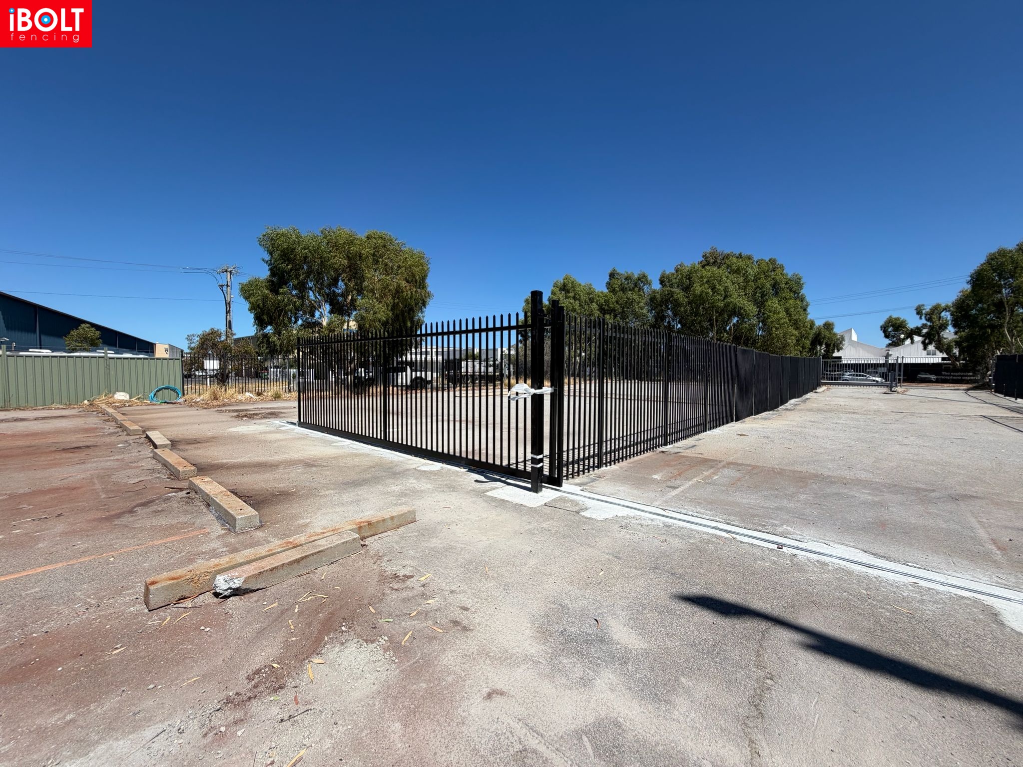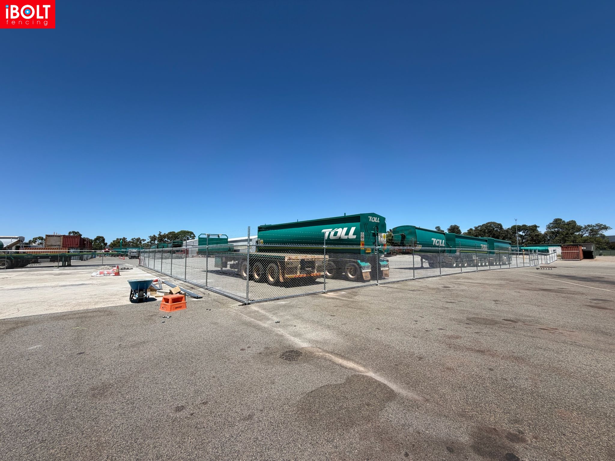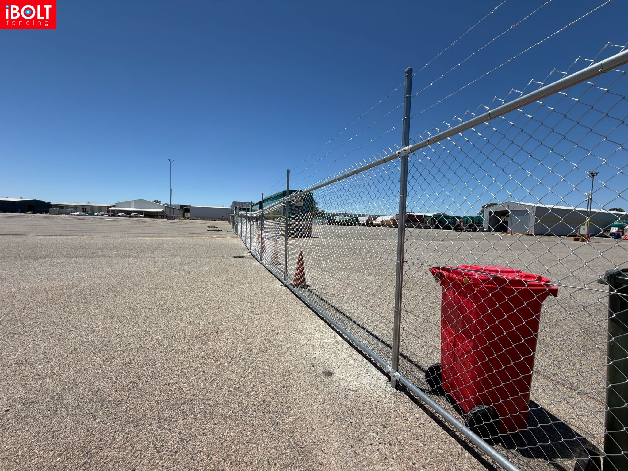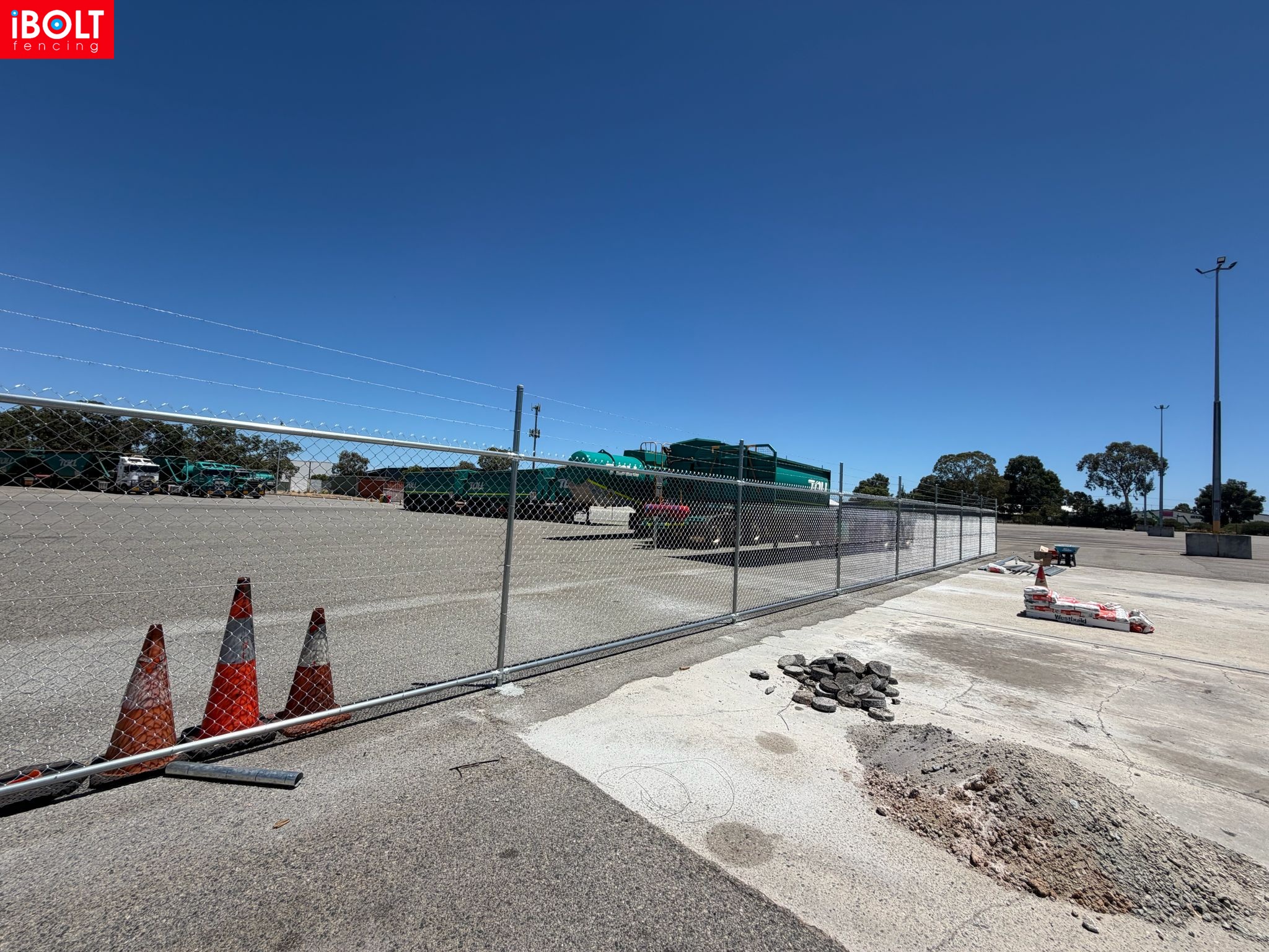 Hesperia – Toll Mining Fencing & Gates Project: Galvanised chainmesh fencing with barbed wire, chainmesh double swing gates, garrison fencing with an automated sliding gate, and reinforced concrete footings core drilled through bitumen, delivered by iBOLT Fencing for long-term industrial performance.
