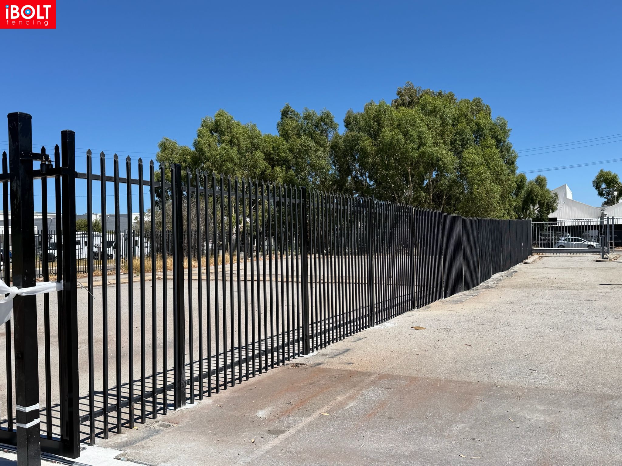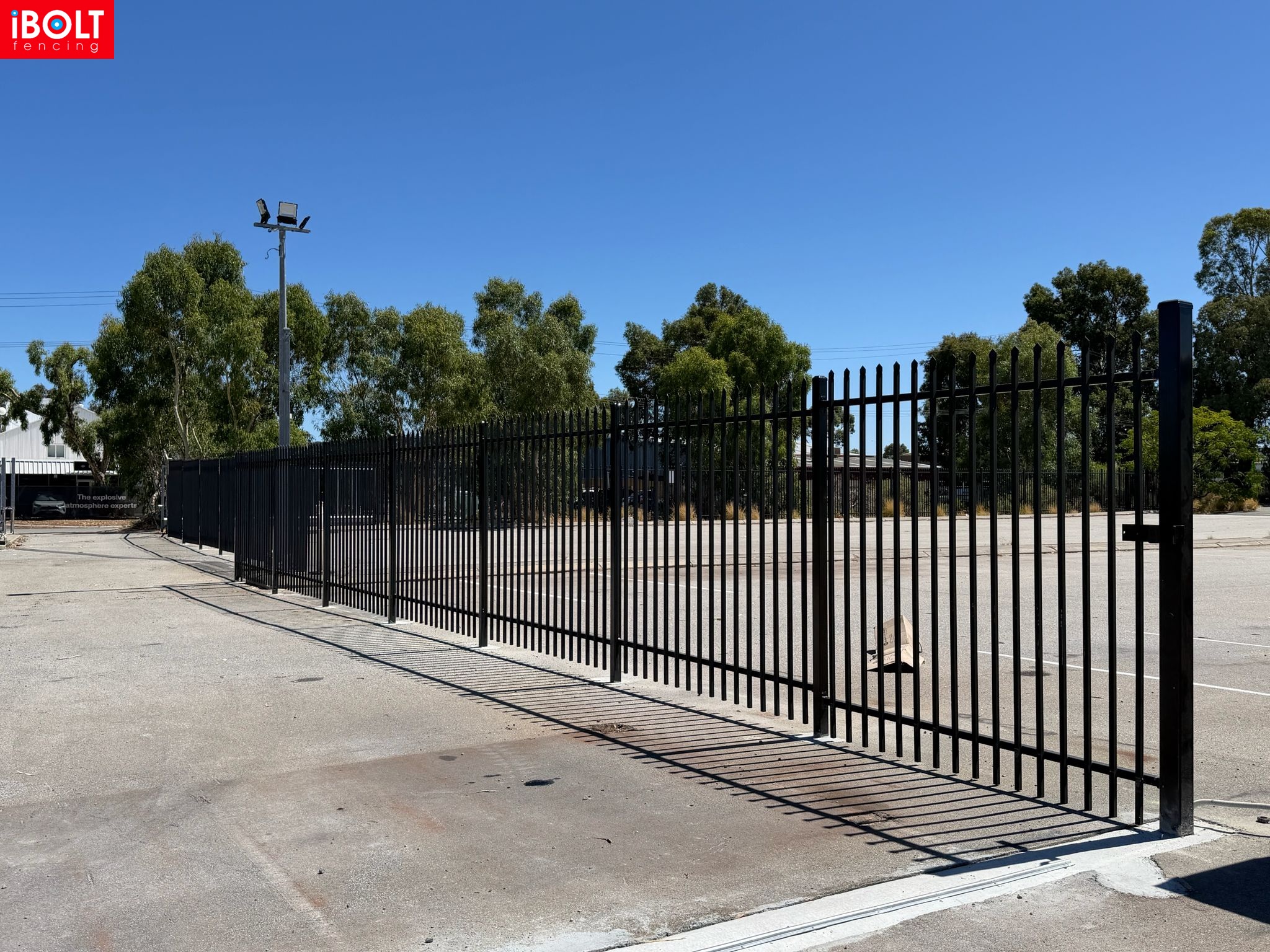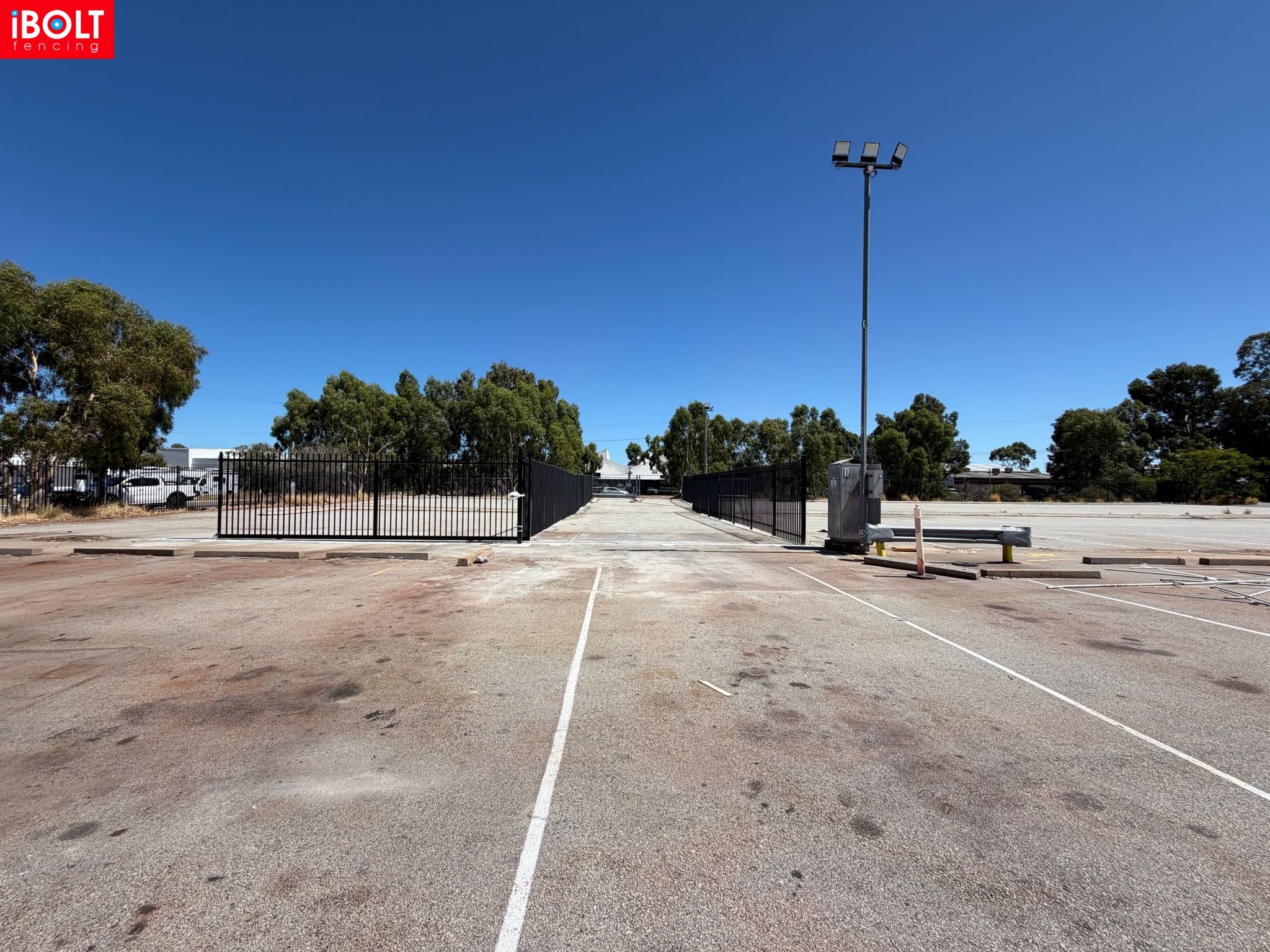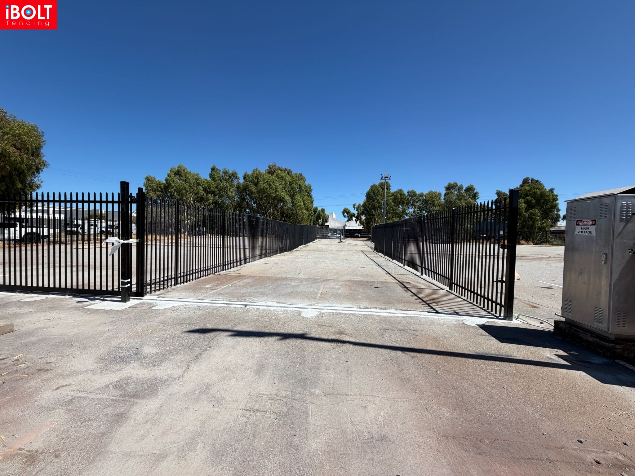 Hesperia – Toll Mining Fencing & Gates Project: Galvanised chainmesh fencing with barbed wire, chainmesh double swing gates, garrison fencing with an automated sliding gate, and reinforced concrete footings core drilled through bitumen, delivered by iBOLT Fencing for long-term industrial performance.