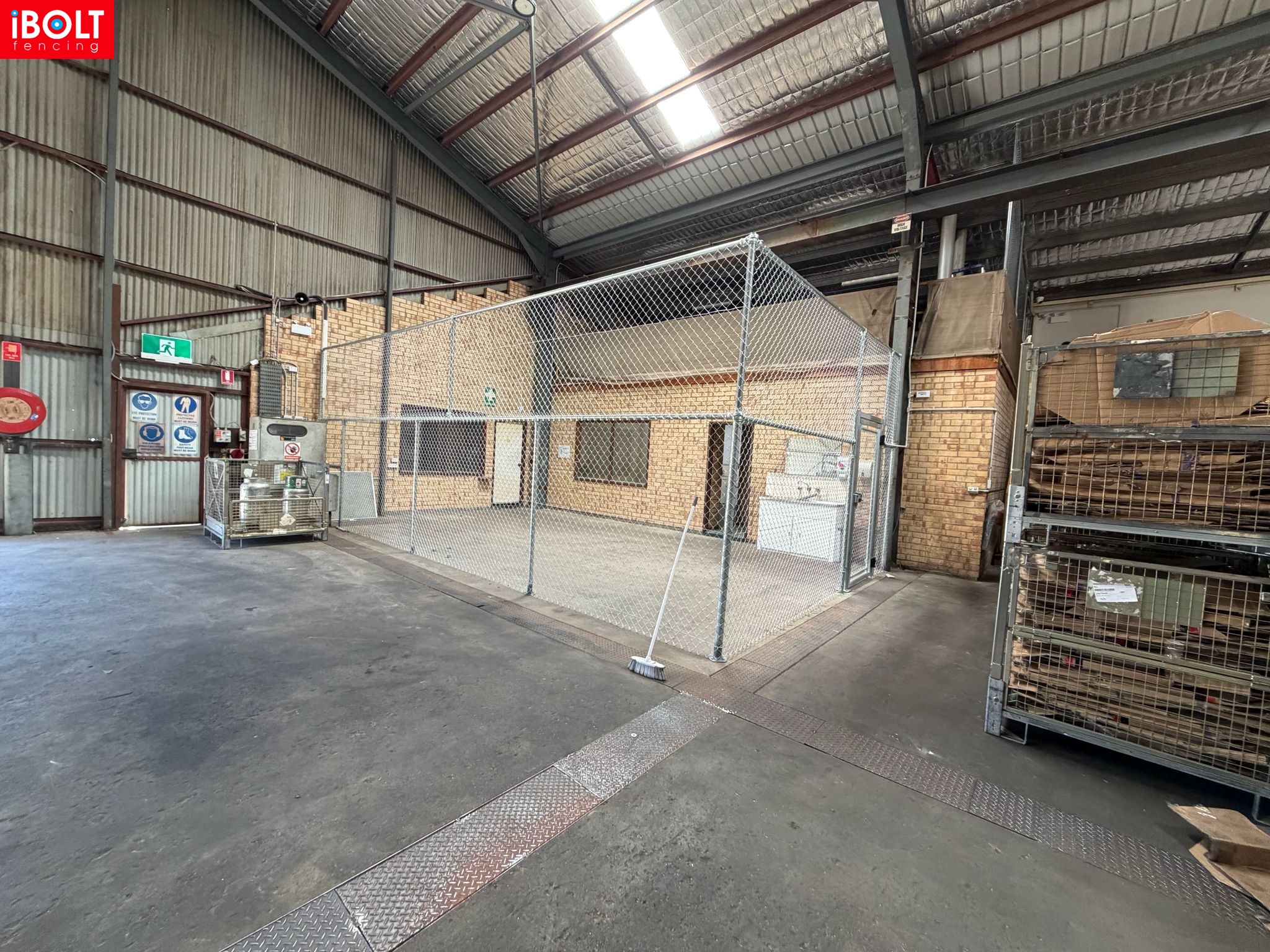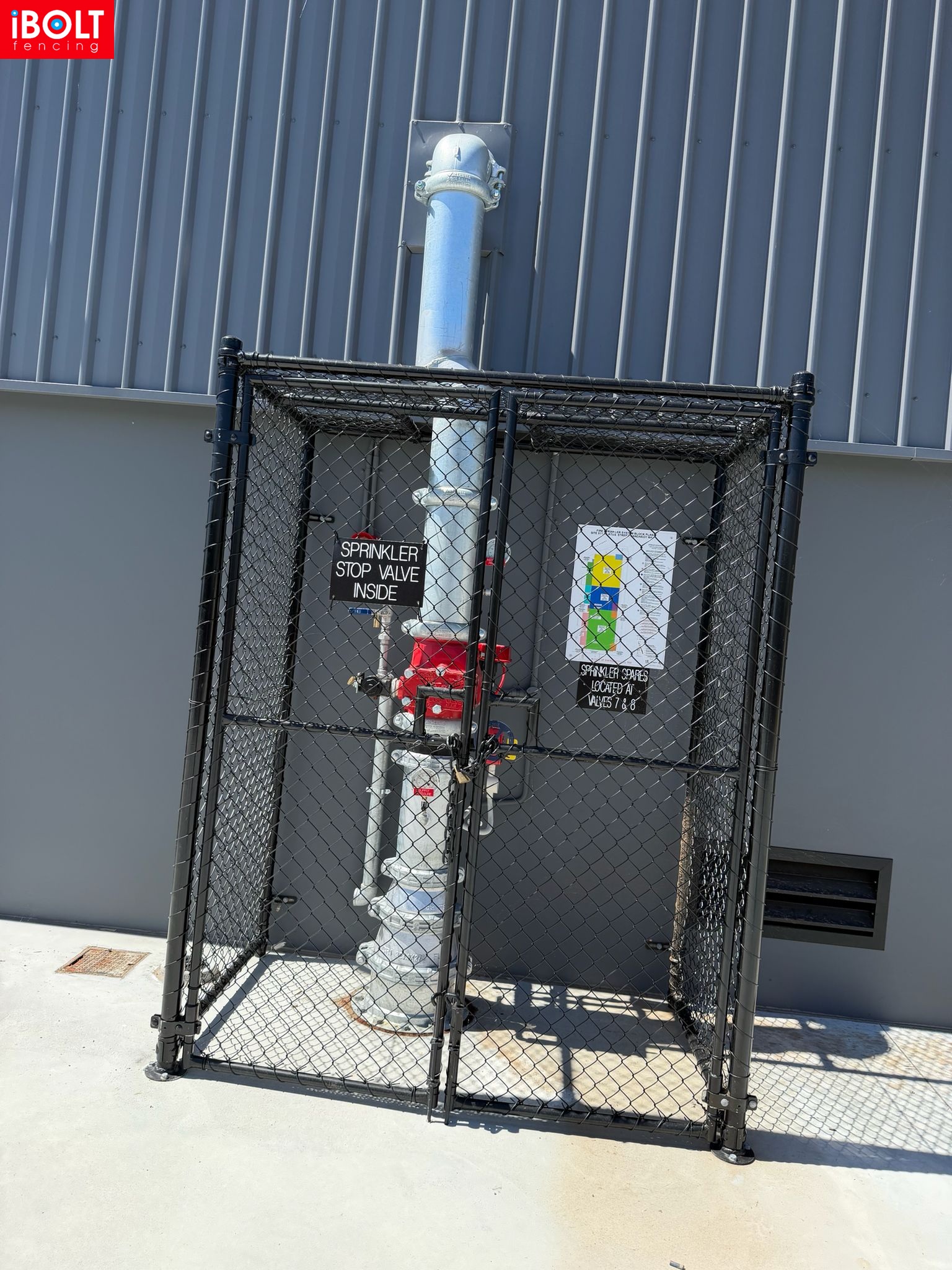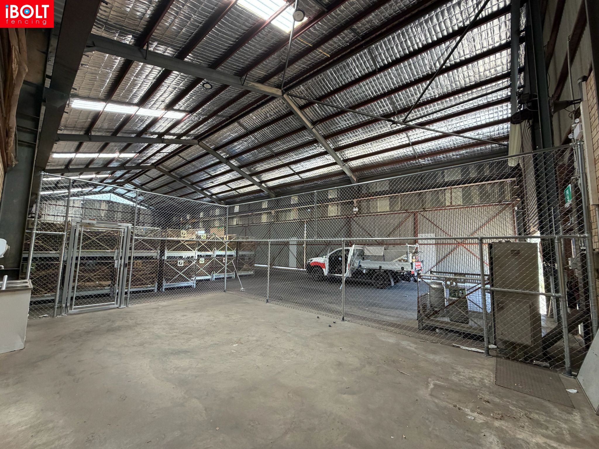 Small Jobs – Specialised Security & Enclosure Works: V palisade fencing, black chainmesh fire enclosures, galvanised high-security gates for border security, and flat-top aluminium sliding doors supplied and installed by iBOLT Fencing.